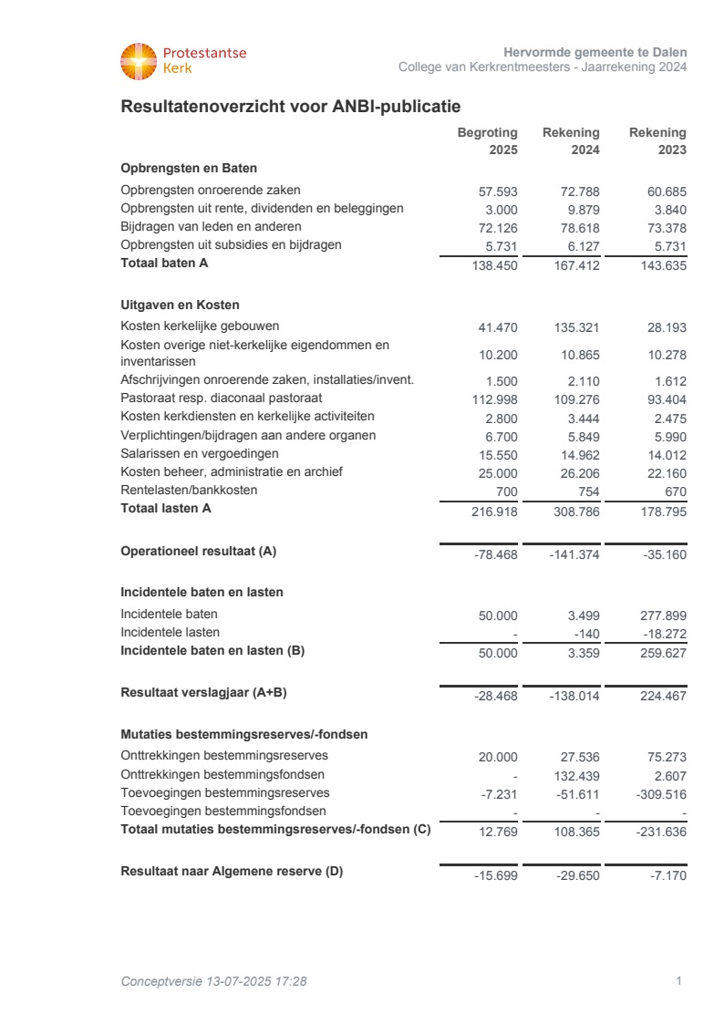 De gehele jaarrekening ligt ter inzage op De Brinken 23 te Dalen. U kunt hiervoor een telefonische afspraak maken: 0524-550556