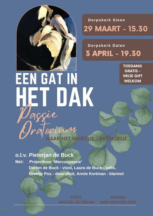 In deze dienst wordt de passie-oratorium ‘Een gat in het dak’ opgevoerd. Deze Marcuspassie is geschreven voor koor, samenzang, solisten en solo-instrumenten. Als instrumentalisten werken mee: Dorien de Buck (viool), Greetje Pos (dwarsfluit), Laura de Buck (cello), Annie Kortman (klarinet) en Pieterjan de Buck (leiding/piano). In deze Marcuspassie ontmoeten we Jezus al ver voor de laatste dagen voor Pasen in allerlei situaties waarin hij ‘een beslissende opening maakt’ en bevrijding schenkt, waardoor mensen weer ‘zicht op de hemel krijgen’ (‘een gat in het dak’). Het uitzicht op zo’n zin-vol, vervuld leven wordt ons vaak geboden door het vertrouwen, de beschikbaarheid en dienstbaarheid van de ander: de trouw van mantelzorgers, de vasthoudendheid van ouders, de tegendraadsheid waarmee mensen voor de ander blijven instaan, kortom: door mensen die mens zijn voor anderen. Deze Marcuspassie duurt vijf kwartier. In de wrange én liefdevolle situaties die leven en lijden van Jezus laten zien gaan tekst en muziek steeds samen op; doordat de muziek de tekst op de voet volgt en verbeeldt wisselen soms sterk dissonante en vaak prachtig harmonieuze gedeelten elkaar af. In het programmaboekje dat de aanwezigen krijgen uitgereikt staan alle gezongen teksten afgedrukt en wordt een aantal aspecten van tekst en muziek toegelicht en uitgewerkt. Iedereen is van harte welkom om deze uitvoeringen mee te maken en de toegang is vrij.